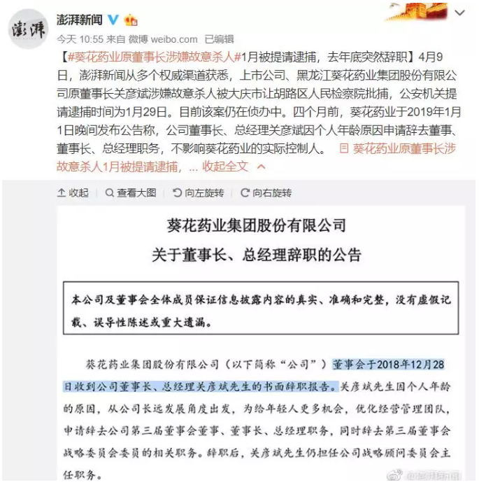 (4月10日),据澎湃新闻报道,上市公司、黑龙江葵花药业集团股份有限公司(以下简称“葵花药业”)原董事长关彦斌涉嫌故意杀人被大庆市让胡路区人民检察院批捕,公安机关提请逮捕时间为1月29日。目前该案仍在侦办中。