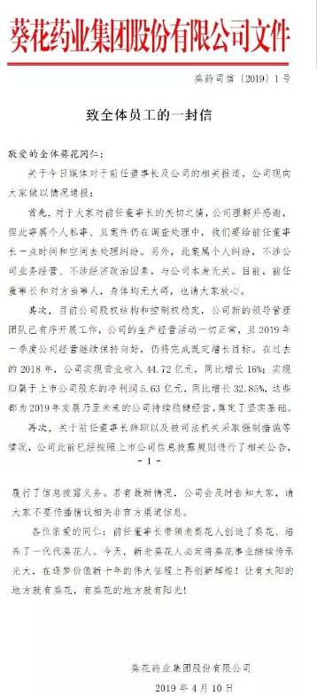 而就在今天下午,在网络上传出葵花药业《致全体员工的一封信》称,对于大家对前任董事长的关切之情,公司理解并感谢,但此事属于个人私事、且案件仍在调查处理中,我们要给前任董事长一点时间和空间去处理纠纷。