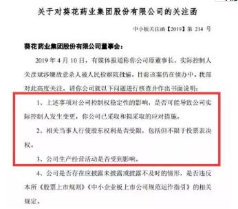 而深交所也对葵花药业发出关注函,要求说明原董事长、实控人涉嫌故意杀人被检察院批捕事项对公司控制权稳定性的影响,是否可能导致公司实控人发生变更;公司生产经营活动是否受到影响等。