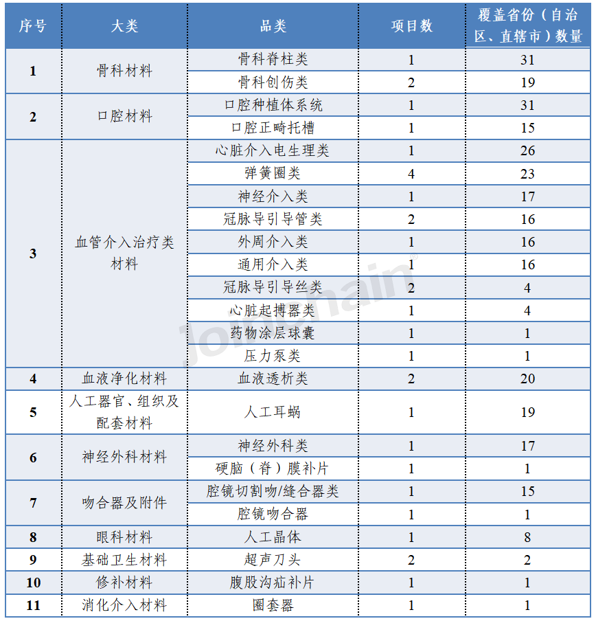 2022年国内高值耗材集中带量采购种类及覆盖区域情况