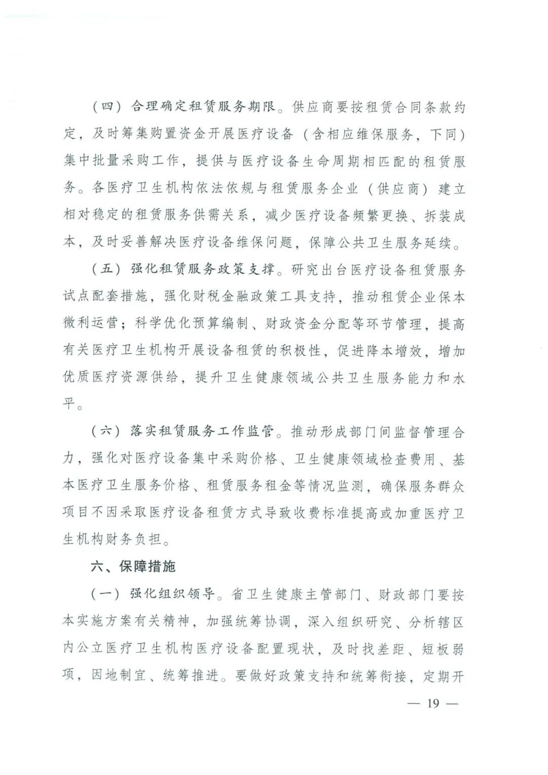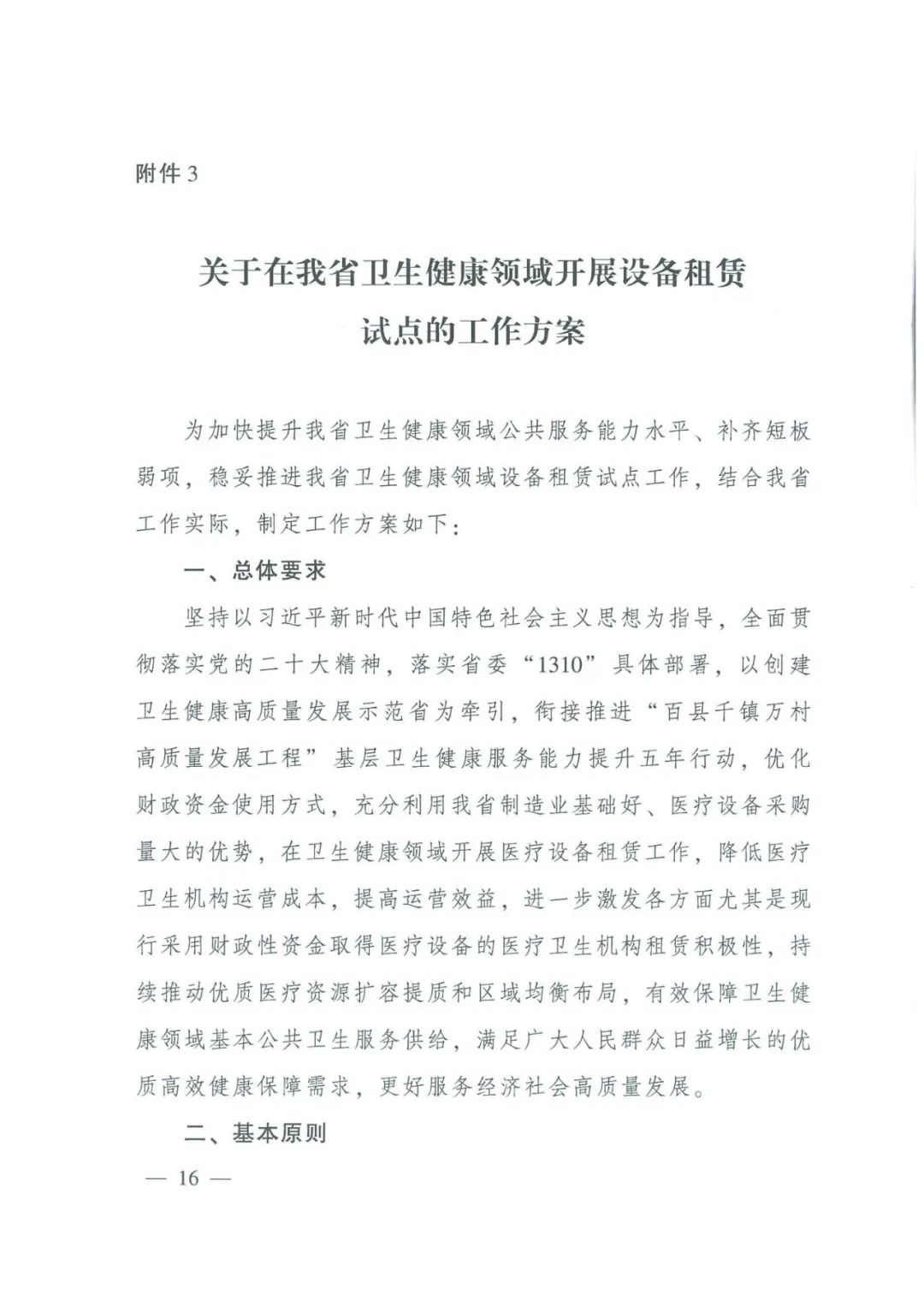 这份文件明确为加快先进设备购置、缓解财政一次性支出压力,提升相关医疗服务能力并补齐短板,开展在医疗机构相关医疗设备租赁试点。